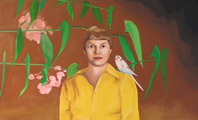 While Howard's paintings portray a slightly more melodramatic version of the inhabitable world, Holly Coulis's paintings are hyperbolic representations seemingly ungrounded in reality. This is due, in part to the curious interactions of the subjects in her paintings, which take place mostly between humans and animals. The tender, loving care focused on these animals makes the beasts the main subject of her work rather than ancillary characters. In Small Accompanists , a dog mimics the standing pose of her owner as best she can on her hind legs, resulting in a humorous illustration of the woman's behavior through the anthropomorphism of her pet. The deadpan expression and confrontational posture of the two figures makes you feel as if you are intruding upon an almost cabalistic moment--a kind of secret world in which the viewer has imposed him- or herself. The perched parakeet, flowering plant, and patterned carpet add to the enigma of the picture while hinting at a deep-rooted history between the various elements. There is also a reverse exchange of characteristics from animals to humans at work in Coulis's oeuvre, which is responsible for some of the more bizarre paintings. The Russians shows a woman draped in a luxurious fur coat holding her precious cub as if she were the matriarch in this bear family portrait, and in The Sirens a male figure swims with his bullish brethren. Coulis's fantastical scenes evoke a certain mystery of, and perhaps instructive confusion about, human nature.