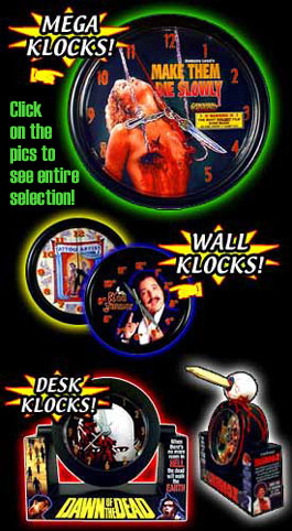 ![]() | YES FOLKS, JUST ANOTHER EXAMPLE THAT I HAVE WAYYYYY TOO MUCH TIME ON MY HANDS! I'm very pleased to introduce my brand new line of hand krafted custom klocks ( there is NOTHING I can't perverse!). I have always had a fondness for clocks. This started in my young school years. The clock on the wall was all that I was paying attention to (well... that and the cheerleader's ass that sat in front of me!). Waiting for the bell to ring, so I could get the fuck out of the classroom, catch a quick smoke in the boys' room, and try to coerce the nubile school girls to blow me under the bleachers (thanks Shannon, ya slut!!). Now, one thing about most clocks is that they all look the same and all in all visually boring. So I, being the master kraftsman that I am, have single handedly, created the world's most unique and klassick time pieces. Each klock I make is artistically (or is that autistically?) hand-krafted and will stand the TESTES of TIME. Leave it to me, A.D. Gore, to make something as conventional as wall clocks, a BONERfied Underground Collectible! As with most of all of my shit, these klocks are not mass produced in a huge scale. Each klock is kustomized by hand and each varies slightly. Though I've just introduced these to my underground market, collectors have been buying them up as fast as I can make 'em. A number of you out there have even written me to let me know they have a different klock of mine in every room of their house! Who wants some boring, plain, clock taking up your precious wall space when you can now get your very own Killing Time Kustom Klassick Klocks! |