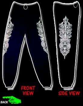 | Any TATTOO enthusiast will be "sweating" to get a pair of these original Maori Tribal Sweatpants! The design is based on the tattoos of a mummified head I once viewed of a Maori Chief that was brought to the states during the turn of the century! On the rare occasion that one of these heads come up for sale it will fetch a price of tens of thousands dollars- but these sweatpants won't cost you ANYWHERE near that! This UNIQUE design is printed down each side of the leg! The print itself is huge-almost 25 inches from top to bottom! You'll be bound to loose YOUR head if you don't get these- so go a"head" and add them to your Satan's | ||||||||||||||||||||||